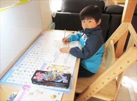 - 学齢前や小学校低学年のうちは、リビング学習が落ち着いて勉強できる環境です。そのため大きすぎたり、いろんな機能がいっぱい付いた学習机は、集中力も散漫になり、ふさわしくないのです。K-modelは勉強をするための機能を絞り込んだ机ですので、大人になっても使えます。購入にあたってお母さんの子ども時代の家庭学習の環境をイメージして祖父母を説得したと聞きました。自分の体験を活かし、自信を持った机選びに感心しました。